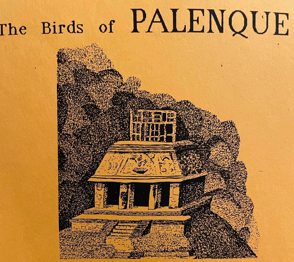 In the 1980s and 90s I spent a lot of time in Mexico leading natural history tours. One place that I spent a lot of time was the archeological ruins of Palenque. The site was quite amazing in itself, and the birds and other wildlife made it even better. Since I was here so often I produced a checklist of the birds, which included notes on other wildlife that we might encounter. The center of the cove was an illustration that I did, and modified of one of the temples. You can see that I added the forested hillside to the background, that was not on the original illustration.