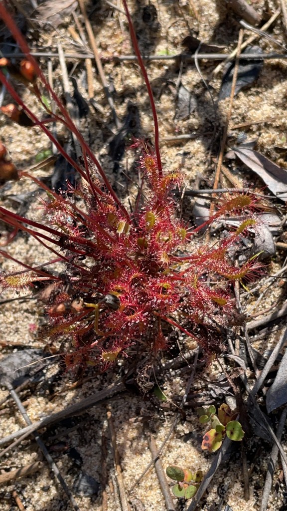 Scattered here and there were late summer goldenrods and asters. But the much smaller sundew plants often attract our attention. We find two species here the round-leaf sundew (Drosera rotundifolia) and the great sundew (Drosera anglica), also called English sundew.