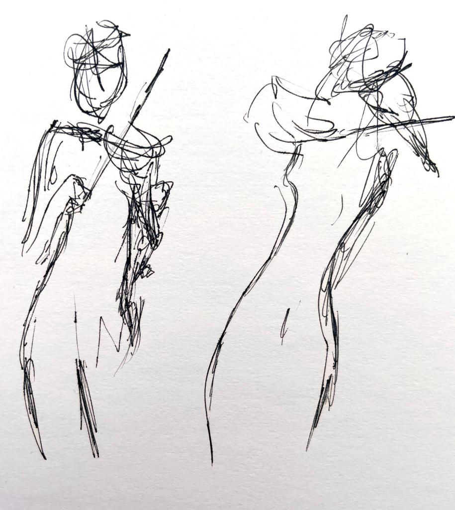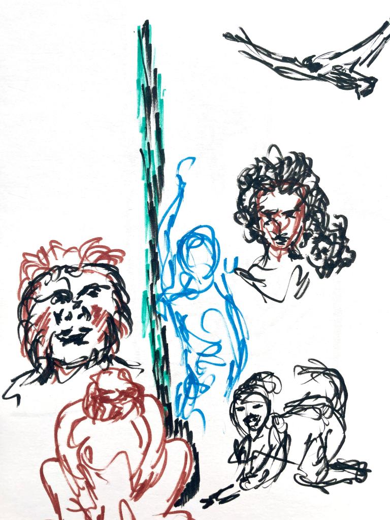 Wherever I have been in the past 40 years I loved to draw. My earliest drawings (from 40-50 years ago) are all very private and I was not confident enough to draw while others were watching. But as confidence built I started drawing when others were around. I took sketch books where-ever I went. In January, 2001 I did the above sketch with colored pens while we were at a performance of the dance “the 100th Monkey.”
