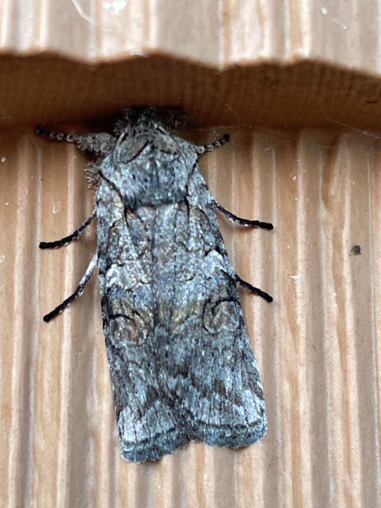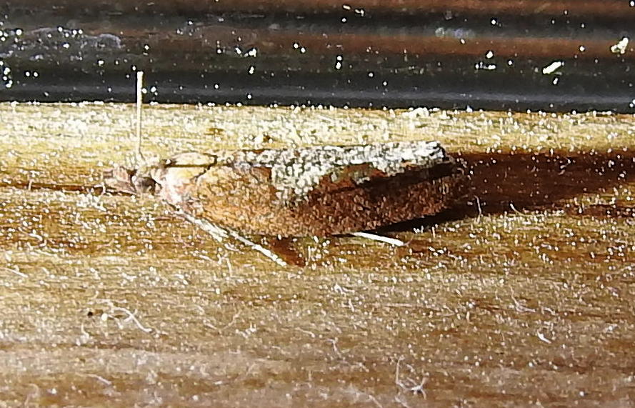 Our only moth this morning, since we had the moth lights off for the night anticipating rain, was this little one at the kitchen window – Epinotia septemberana, a moth without a common name.