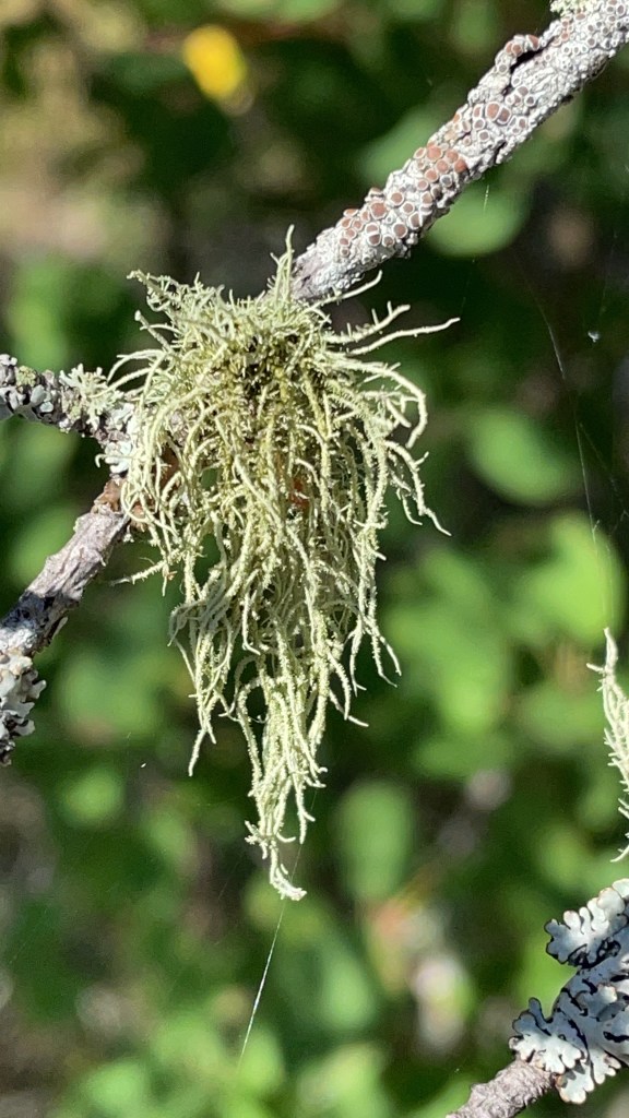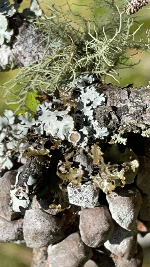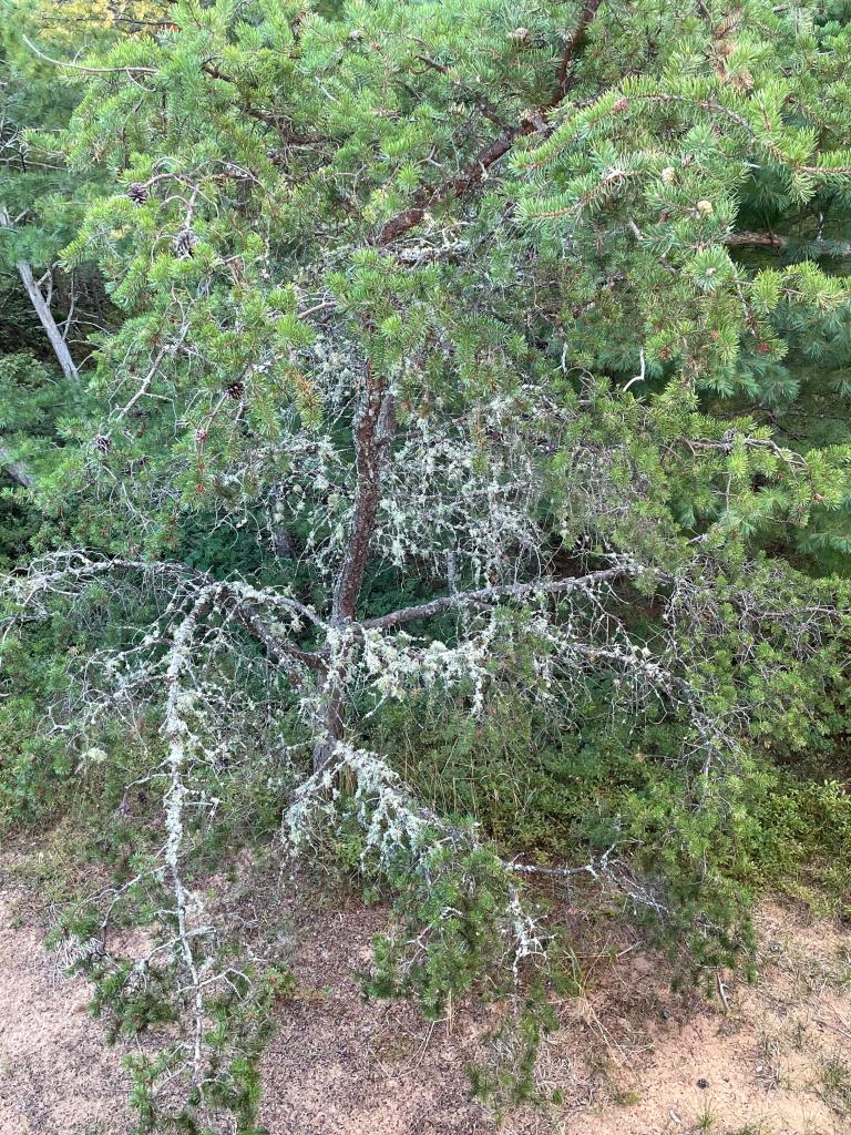 But while I was photographing moths I looked over at a jack pine next to the deck and saw the diversity of lichens, reminding me that we should take a walk and look for plants and lichens.