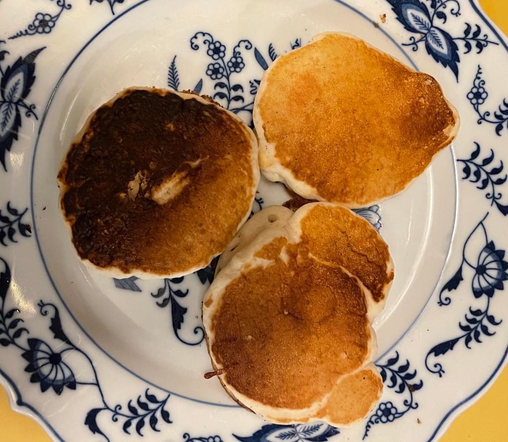 I peeled the apple, removed the core and sliced into thin circles that I then dipped into pancake batter. Thus, the apple became part of the pancakes for breakfast.
