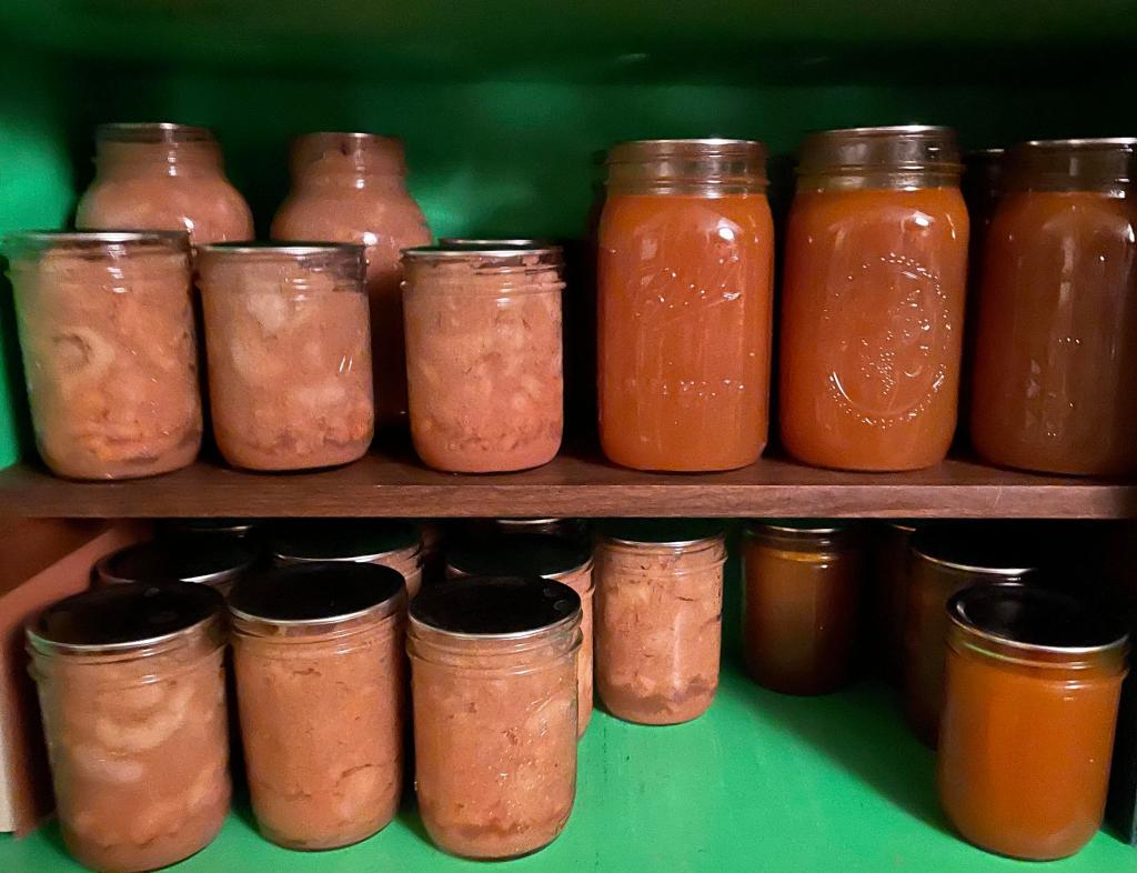 But this late summer Susan picked lots of apples from nearby trees and canned a lot of apple sauce which is now in the pantry with the vegetable stock (the darker red on the right) that she recently made.