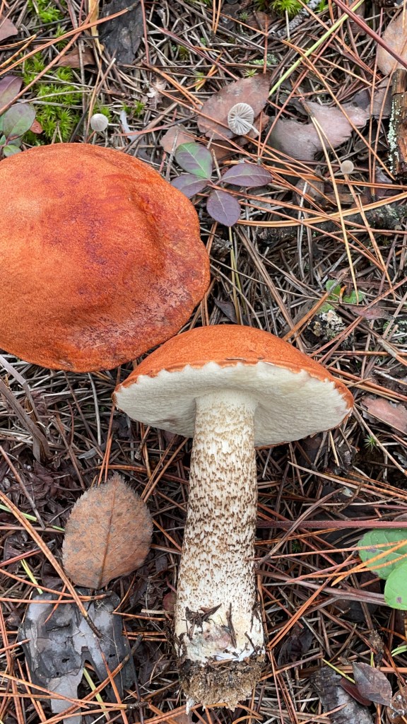 Before getting to the art challenge for the day, we had to run errands and decided to do this in a “logical” step-by-step way. First we visited a bog where Susan wanted to look for cranberries. She found some, they were Vaccinium oxycoccos, the small cranberry that tends to bloom before the typical large cranberry. While she was looking fr cranberries I spent the time looking at other things. That’s how I found the bolete pictured above.