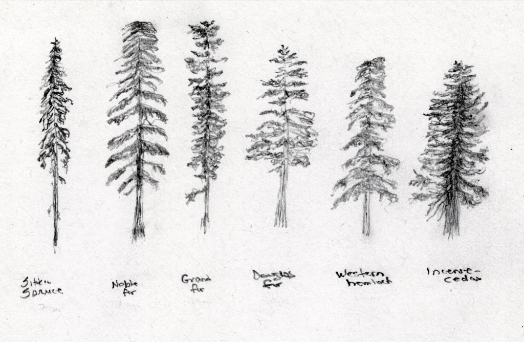 Before I retired, perhaps 2017, I had a student assistant who wanted help drawing trees. That got me to doing some little sketches of western conifers. We usually see quite a variety of these (many more that the six shown) when we visit Alexis in Oregon.