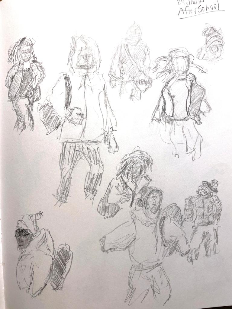 It was about 1995 in the winter that I decided to sketch people walking outside as they passed our house. I called the project “Who are the people in our neighborhood?” It was a lot of fun