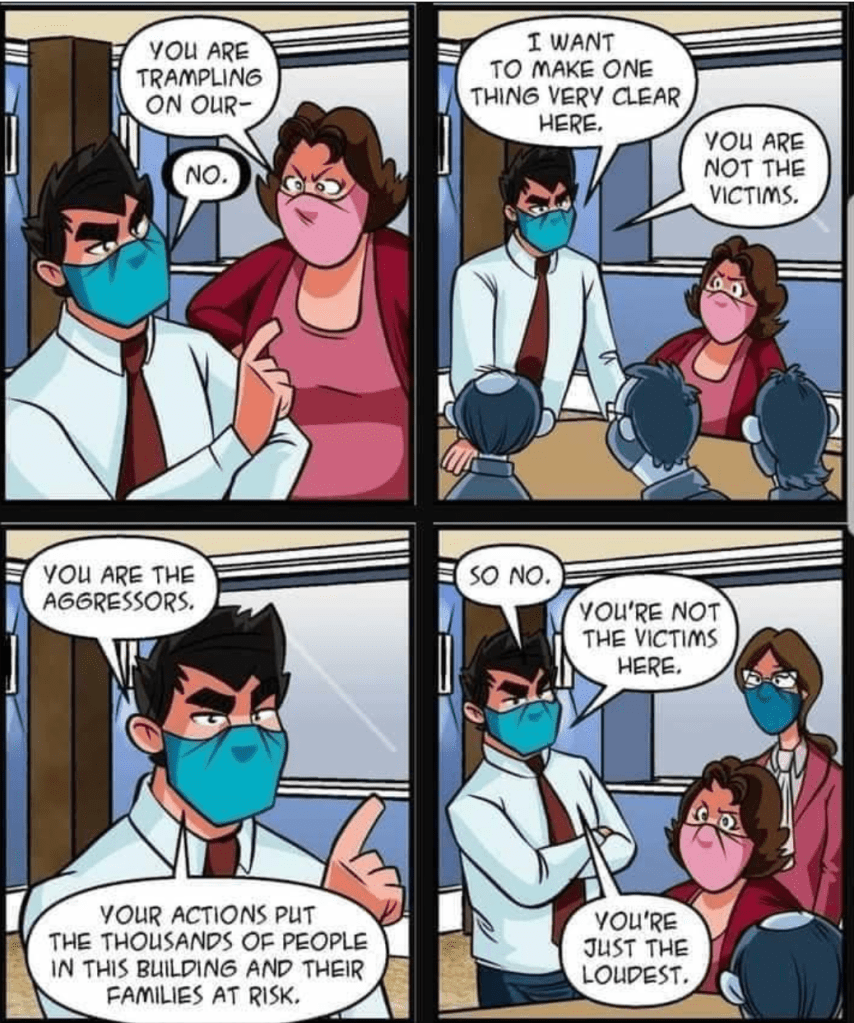 The sad issue in Michigan is once you get away from the Liberal parts of the state the virus is growing in number of cases. People are refusing to get vaccinated (as in the cartoon, “trampling on our rights) or wear masks.