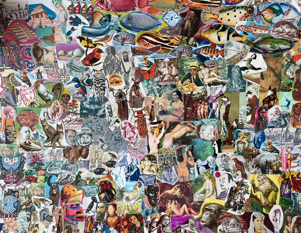 The above piece of art I created years ago from stamps that were essentially worthless. I cut them around interesting images and stuck them down onto a piece of watercolor paper. Each group in there tells its own little story. There are birds and Primates all over the place. A group of fish. There are even a few ruins from Mexico. It was an interesting little project that I might repeat in the near future. Now, on to the garden