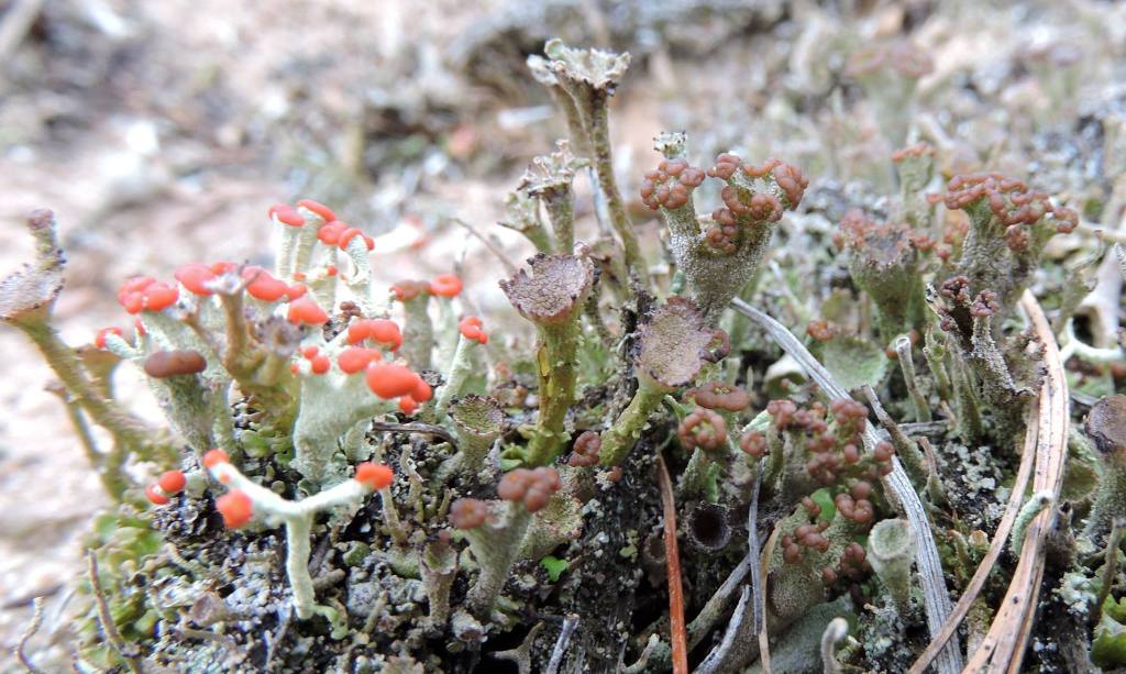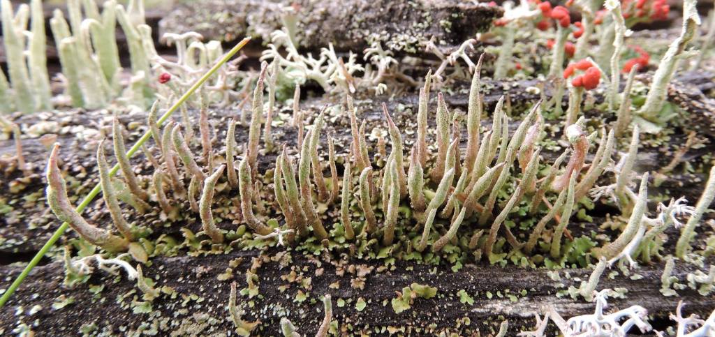 Often I will find small groups of Cladonia on sandy soils or old logs. I am frequently alerted to their presence by the red fruiting bodies of the British soldiers, although some are brown. But I always stop to look because typically where there is one species there will be others.