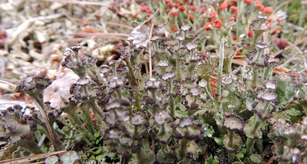 A few days ago I casually mentioned Cladonia. I should have been more thorough in my comments, as at least one person asked what they were. Cladonia is a genus of lichen. They are rather small, rarely over 40mm tall. As with all lichens they are a symbiont of an alga and a fungus. Their names reflect the taxonomic status of the fungal component.