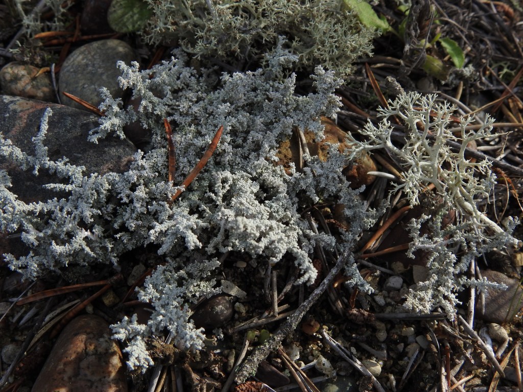 A 3×3 m patch of reindeer lichens on the sand near our cabin at Whitefish Point. This is what much of the open area of our property looks like. The is some scattered false dune heather among the lichens. The reindeer lichens are in the genus Cladina. In this picture green reindeer lichen (Cladina mitis) and gray reindeer lichen (Cladina rangifera) can be seen (they dominate the lichens on sandy soils), but there is also sand-loving reindeer lichen (Cladina arbrucola) which can very difficult to distinguish from the gray, and not possible in this photo. A fourth Cladina not seen in this picture is Cladina stellaris, star-tipped reindeer lichen, the least common and perhaps most beautiful of the genus.