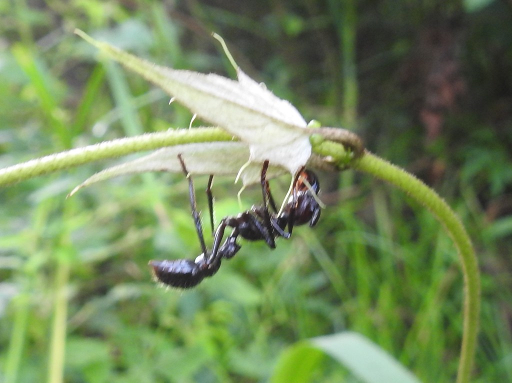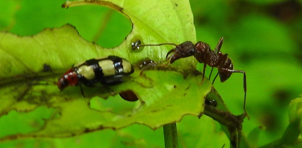 A beetle and an ant – prey and predator. The ant might be a small bullet ant, which are active predators on other small insects.