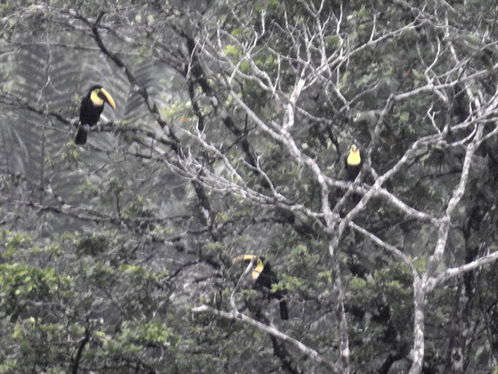 Toucans in a distant tree. Just above the right-most bird is a mealy parrot.