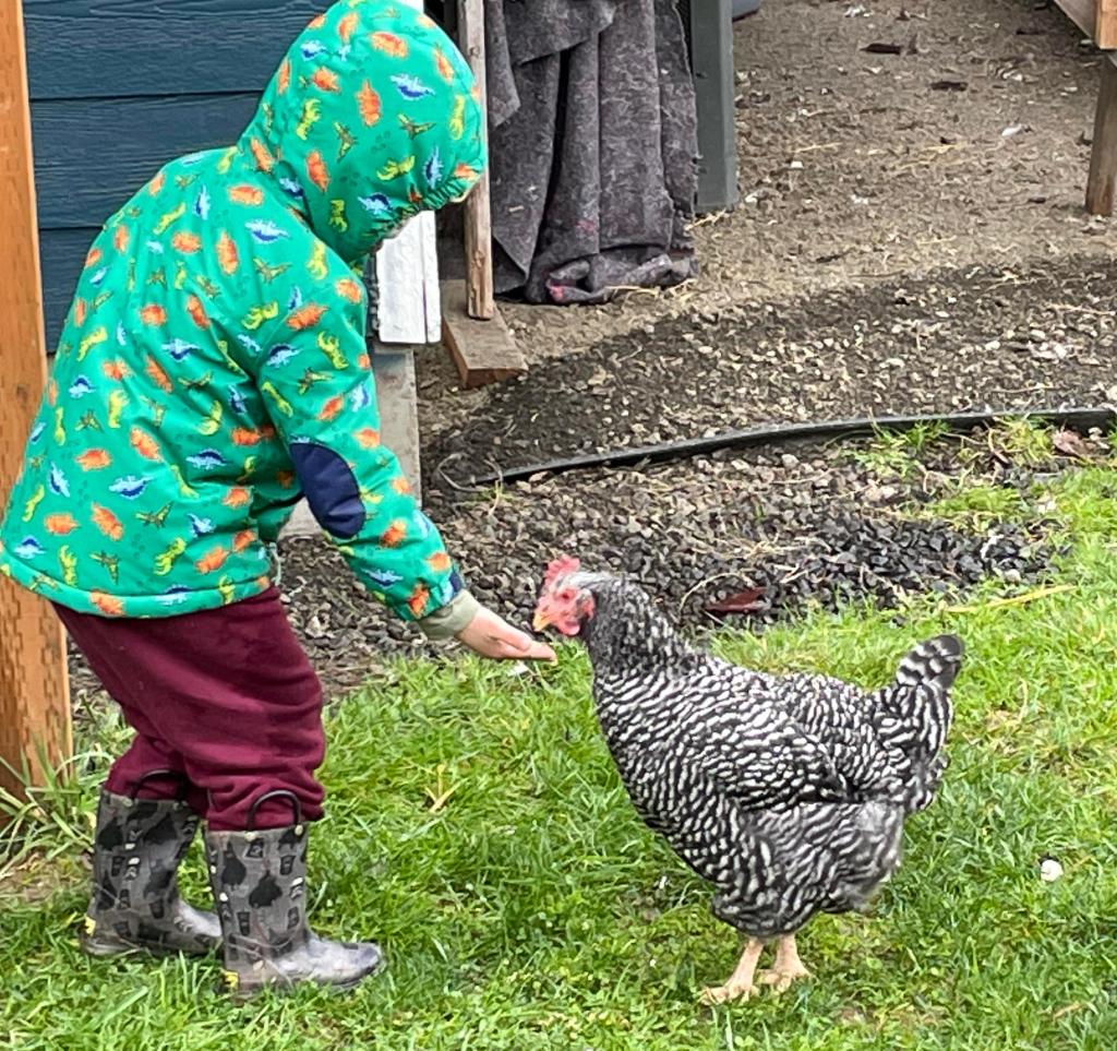 With a little patience Oscar was able to get a chicken to eat out of his hand.
