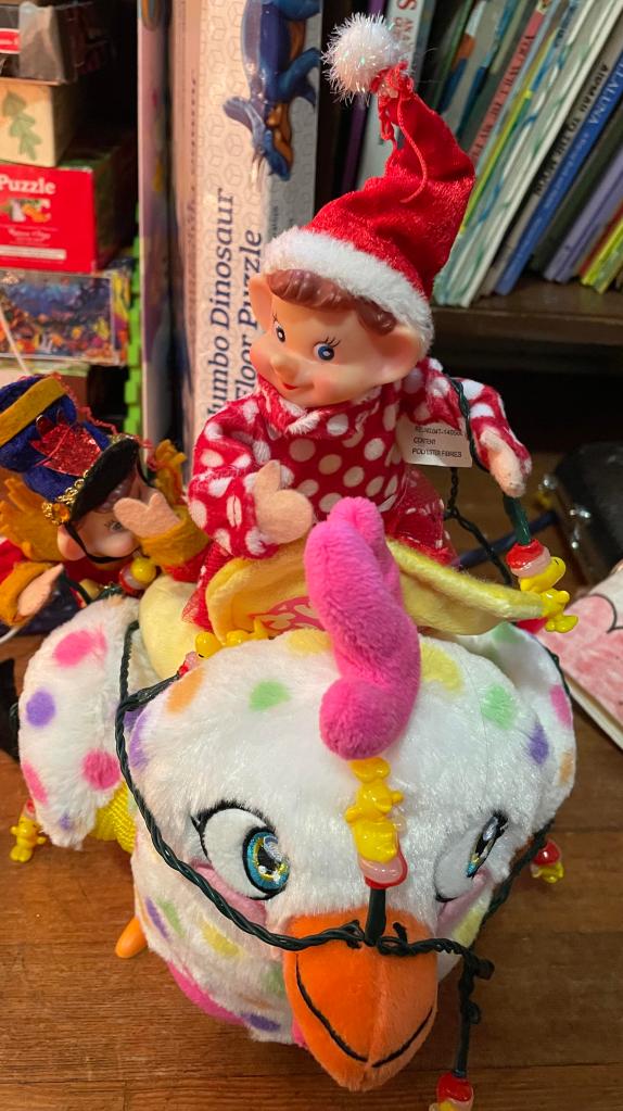 But the elves are happy playing in the house, after a long night of frolicking near a delightfully decorated Christmas tree.