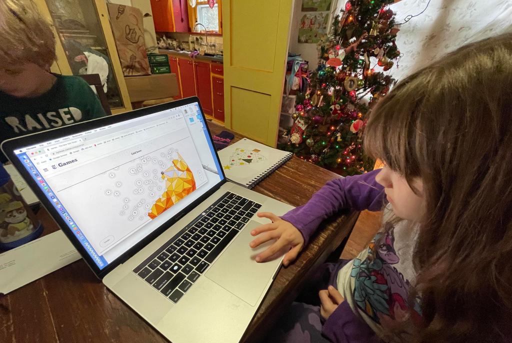 Then I showed Camilla a jigsaw puzzle website where she could pick out both the picture and the number of pieces in the puzzle. After two or three of those it was on to the New York Times puzzle page and vertex, a puzzle where you use triangles to make a puzzle. Well, Camilla is a little puzzle monster! Once I showed her how to use the track-pad to connect the dots to make triangles she was off!
