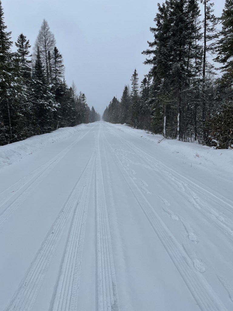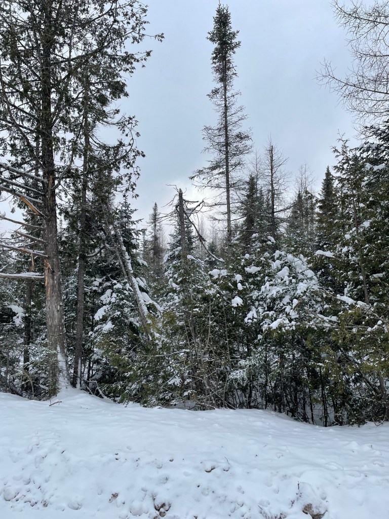 While there was an inch or so of snow on the road, the plowed shoulders had several feet. The conifers, dominated by cedars, spruces and hemlock are an attractive place to search for birds and plants. Today we’d have to settle for hearing the jays flying off into the distance, not once checking out our piles of peanuts and sunflower seeds along the road.