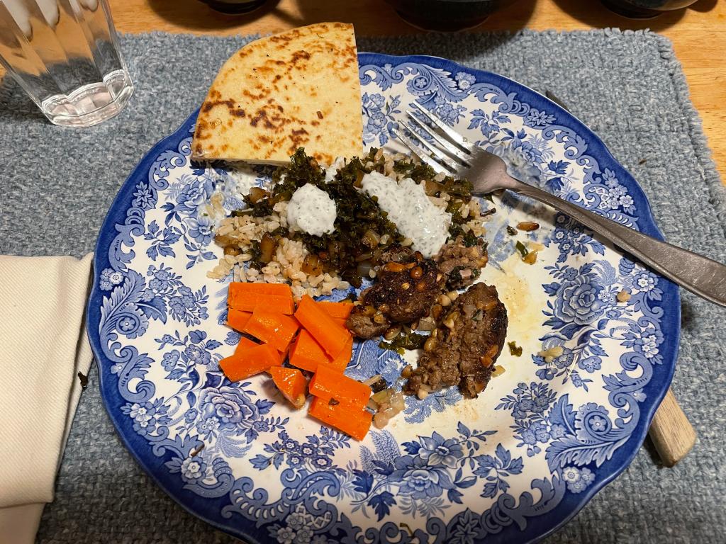 I made lamb kofta for dinner last night. I’ve been making this for years. it requires some planning. The day before I made the kofta spice mix. Then I prepared the kofta mix. Susan pan fried the kofta. It was served with a mint-lemon yogurt sauce, steamed carrots, brown rice and kale (still getting it from our garden) sautéed with pine nuts, onions and garlic. Then everything is served with quartered flat breads. Dinner ties into the color theme – orange/red.