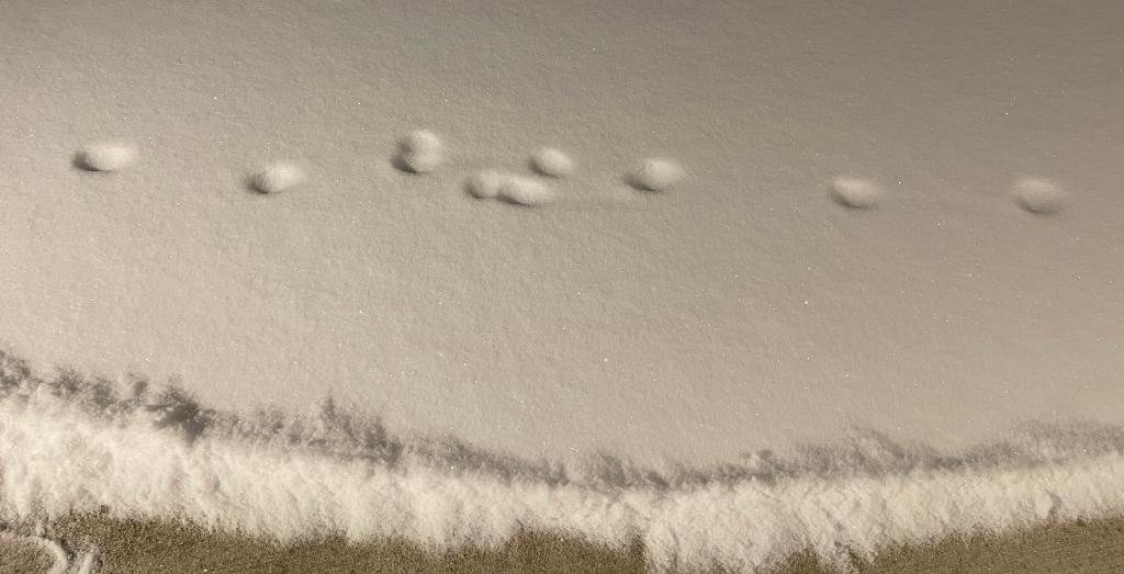 I shoveled about two inches of snow from the drive, so I could get the car out to pack for our trip south. Obviously, some animal walked across the drive in the darkness.