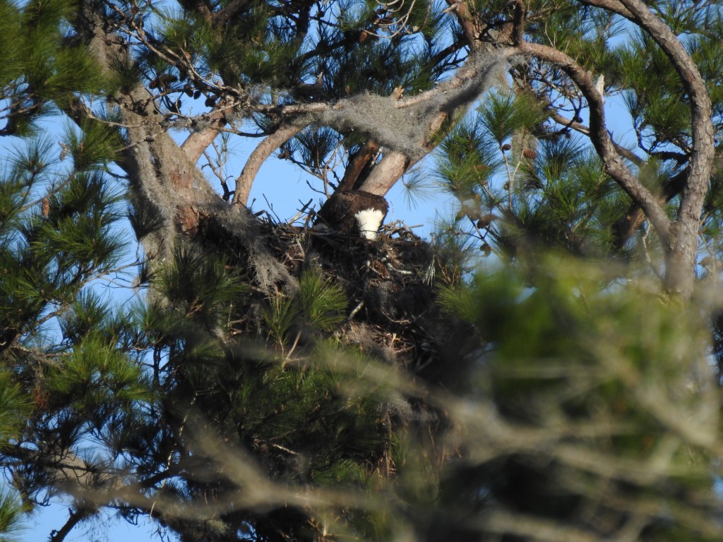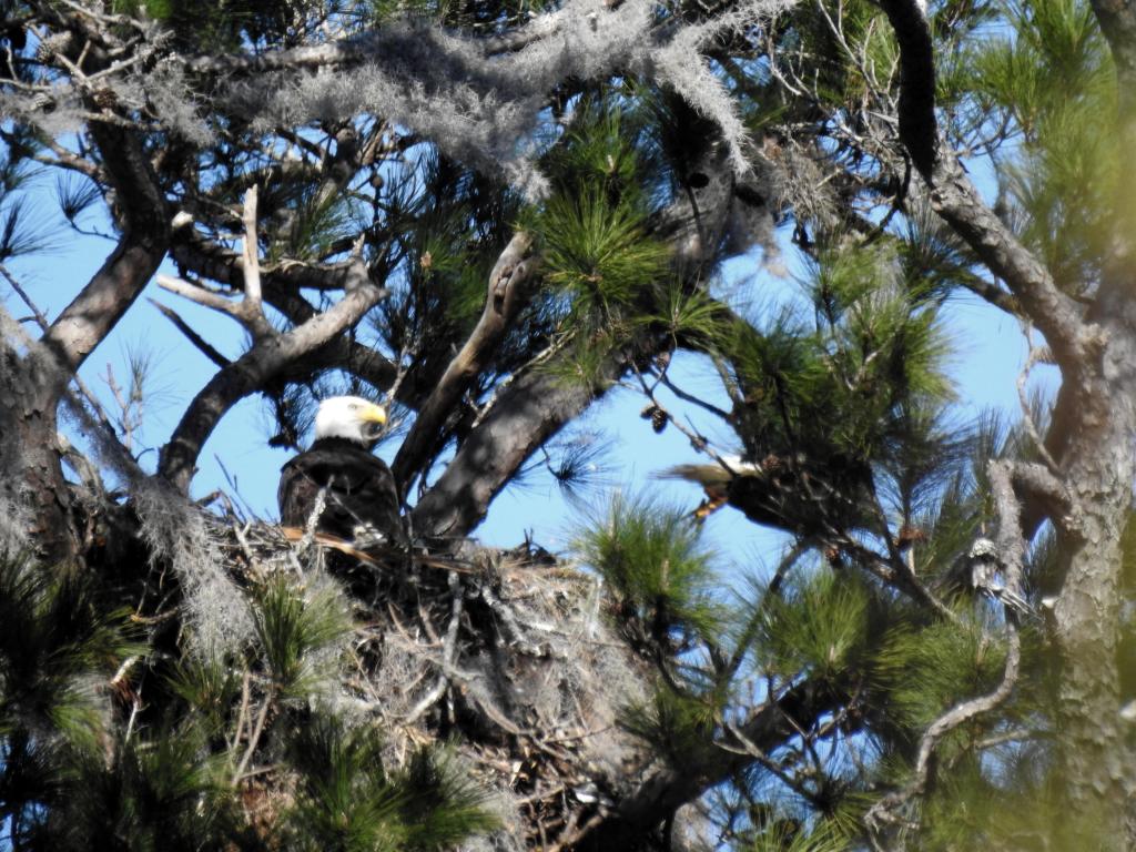 We were able to watch an eagle nest. In one picture an adult is feeding an eaglet. In the other one adult had delivered a fish, you can see its feet and tail as it left the nest as I was taking the photo.