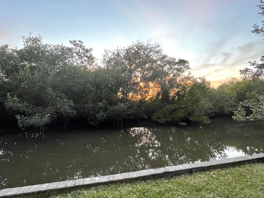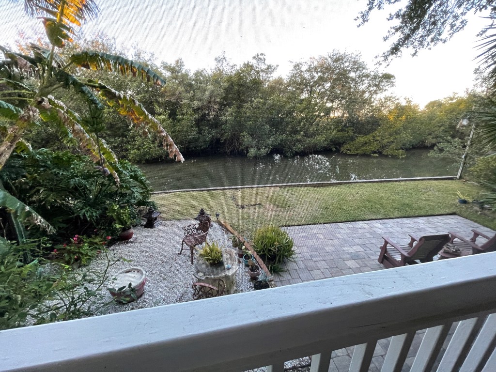The view from our screened in porch to the tidal canal, about ten yards away.