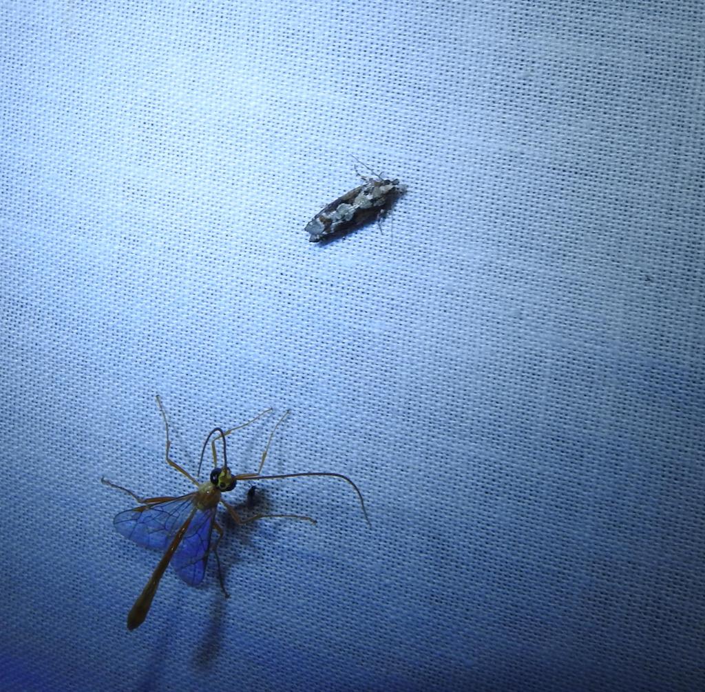 Sometimes the moths showed up with wasps. This one is similar to one that we get in Michigan, and is not at all threatening.