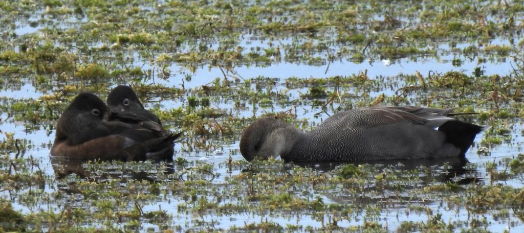 The male Gadwall on the right is quite subtile in coloration. I wish that I had caught it with it’s head up, but it was actively feeding.