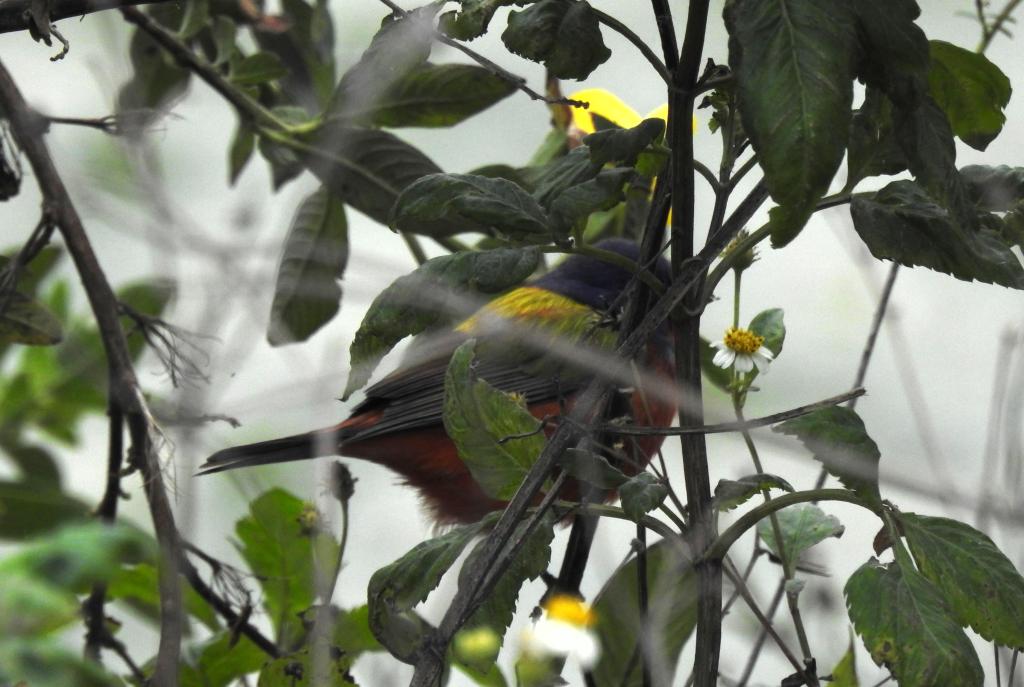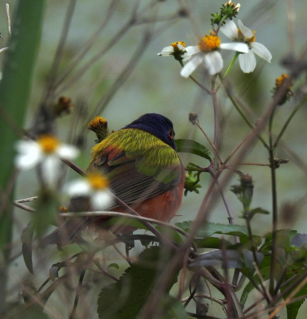 Another bird that we had a good look at was a male Painted Bunting. It was eating the seed-heads of the Spanish Needles (the white flowers in the left photo). For a while it even sang.