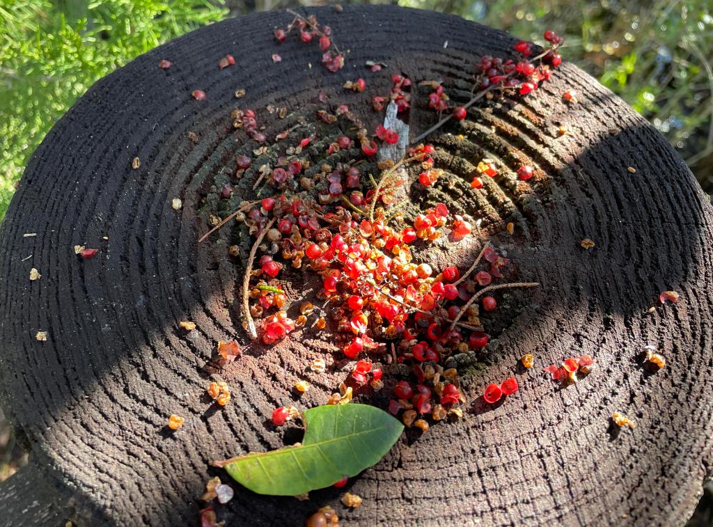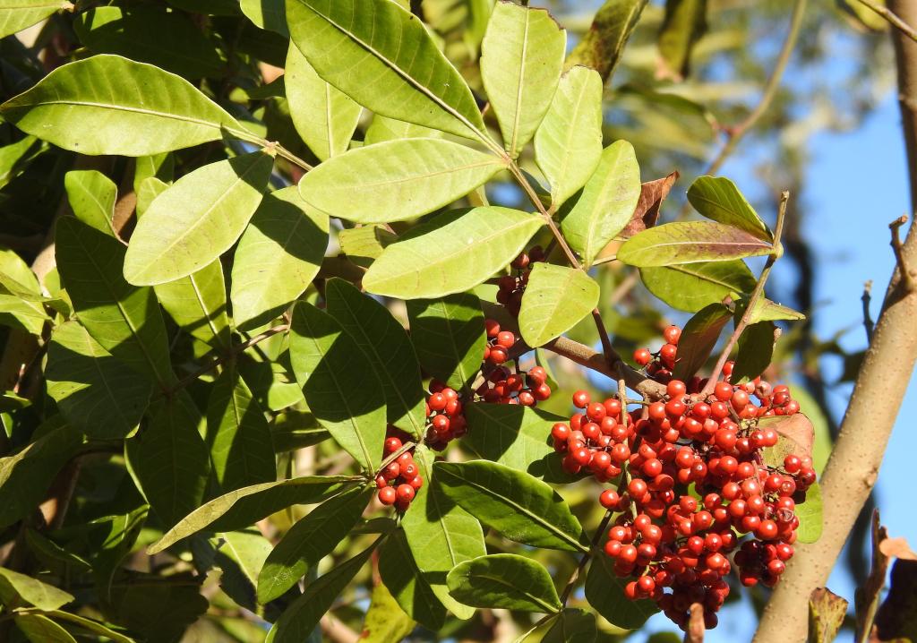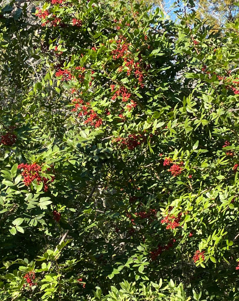 The “pretty” berries are from Brazilian pepper, a weedy invasive species that has taken over every trail that we have hiked. Animals like the fruits and distribute the seeds.