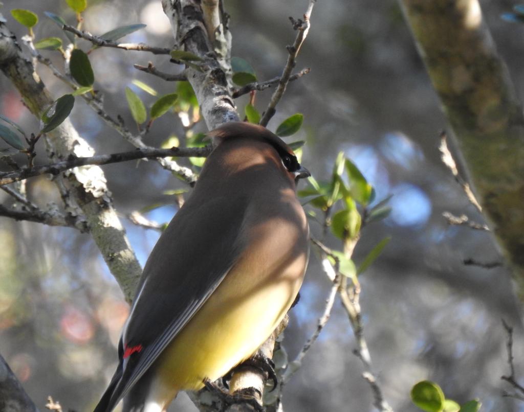 Here is a close-up of the fruits and one of the Cedar Waxwings that was feasting on them, along with a large flock of robins and some Yellow-rumped Warblers.