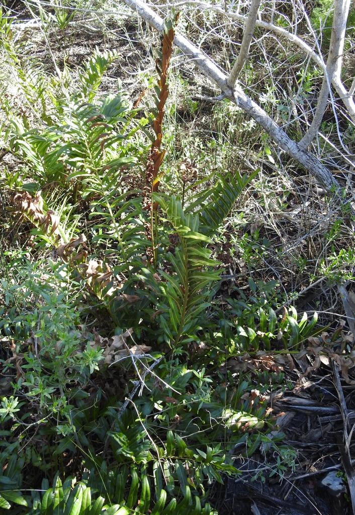 Walking along a boardwalk we saw this rather boring plant. In reality it was the fertile frond of Giant leather fern. This fern 6-7 feet in height.