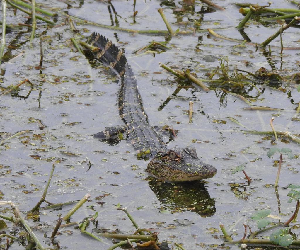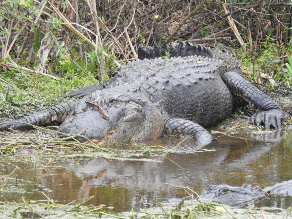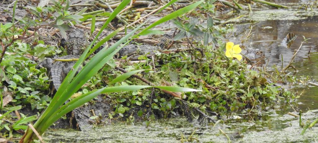 Here are four presumed siblings on shore in front of the parent. Yes, alligators will survive another year.