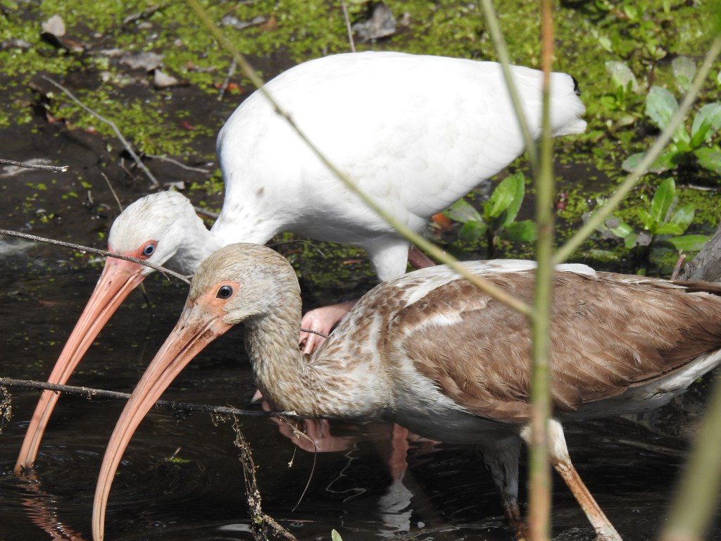 An adult and juvenile White Ibis.