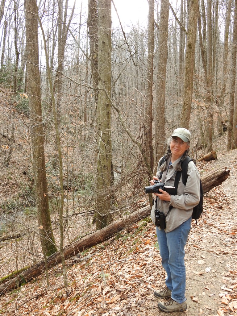 Susan on the trail surrounded by Mountain laurel, Giant rhododendron, tulip-tree, Sugarberry, a variety of oaks and more.