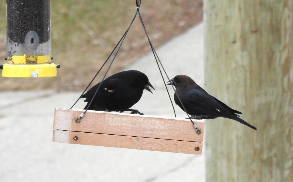 Birds are starting to appear as February transitions into March. Here are two males feeding on refilled feeders. The left bird is a Red-winged Blackbird, the right bird is a Brown-headed Cowbird.