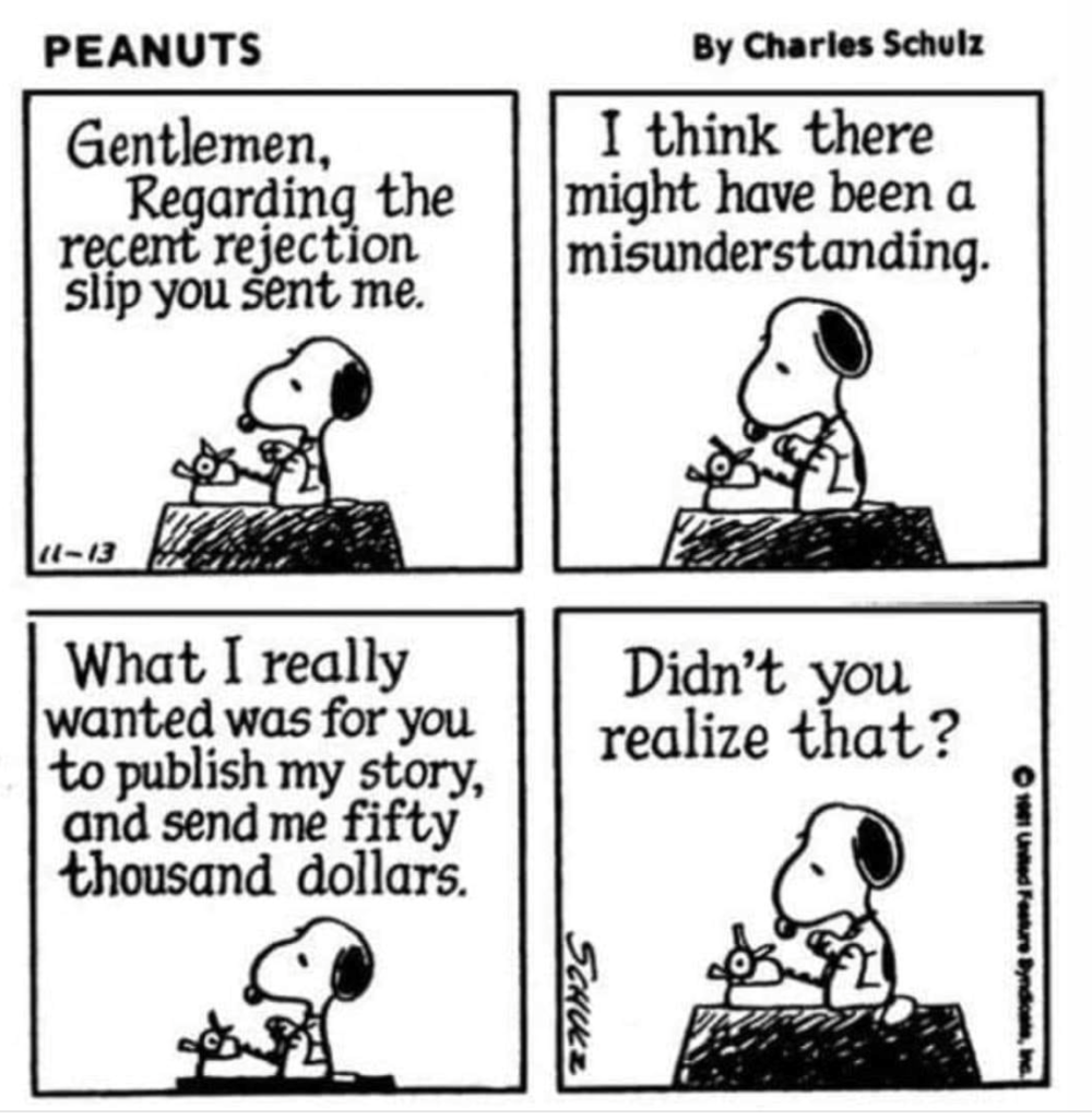 Unfortunately, most new (or naive) writers are like Snoopy. But few will ever experience this. But I can say from experience that it is a lot of fun.