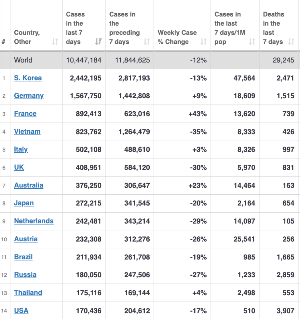 The global situation over the past week with the SARS-CoV-2 pandemic. I expect numbers in the US to start rising by the middle of April.