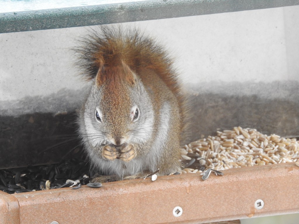 Our feeders many visitors beyond the common Blue Jays and Common Redpolls. Red squirrels seem to prefer the feeder on the deck, where they can feed while not standing in the snow. Once the snow is gone (another week or two, depending on the rain that is forecast) they will feed on the seed that is scattered below the feeders hanging from trees. The Red-breasted Nuthatches however are using all of the feeders.