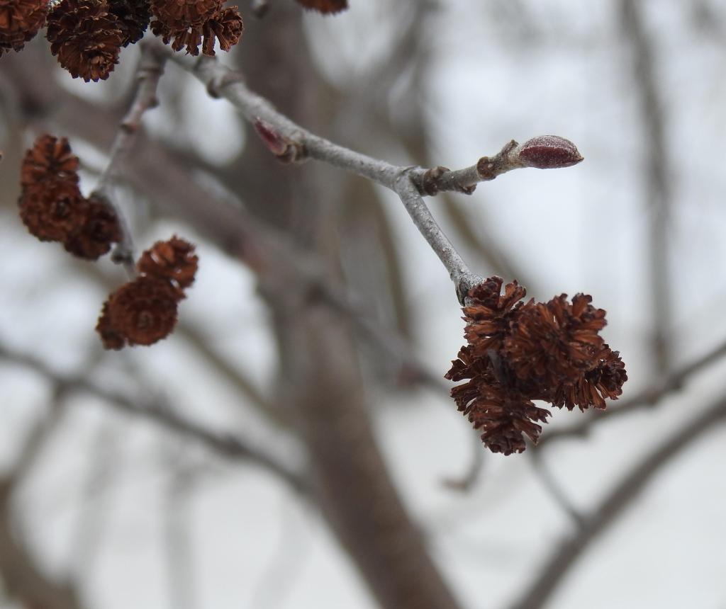 Walking to the Whitefish Point Bird Observatory allows us to have nice looks at Alnus rugosa, the speckled alder. These are the small cones on one.