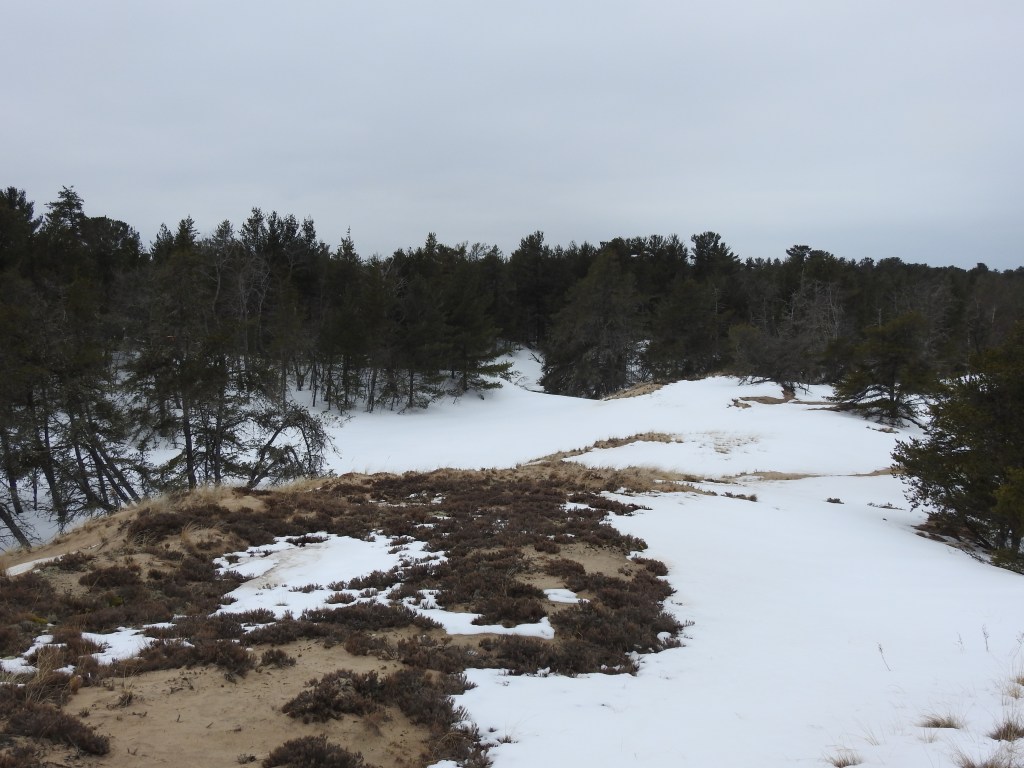 The walk from the museum up the stairs on the dune takes us to the hawk observation platform. There’s still plenty of snow on the swales between the dune ridges. There have not been many migrant raptors yet.