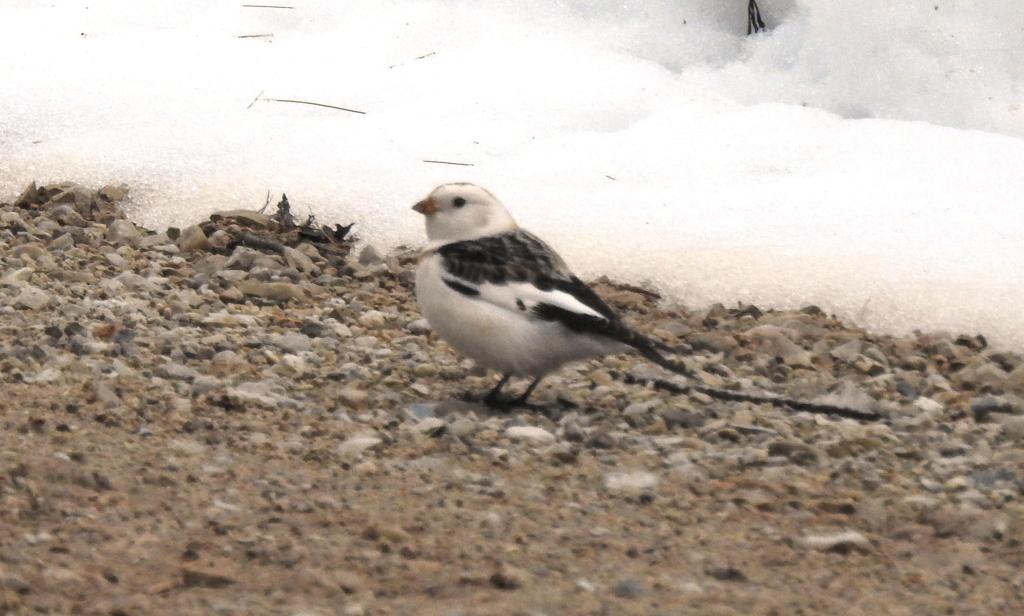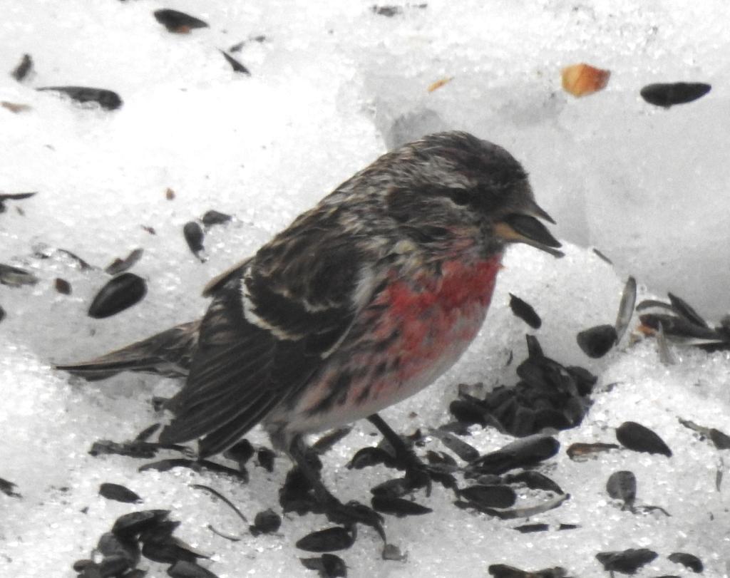 The redpolls and Snow Buntings have no problem with feeding on the ground. The redpolls will also use the deck feeder, deck, and other feeders.