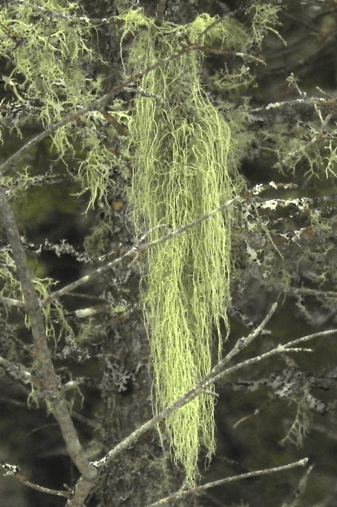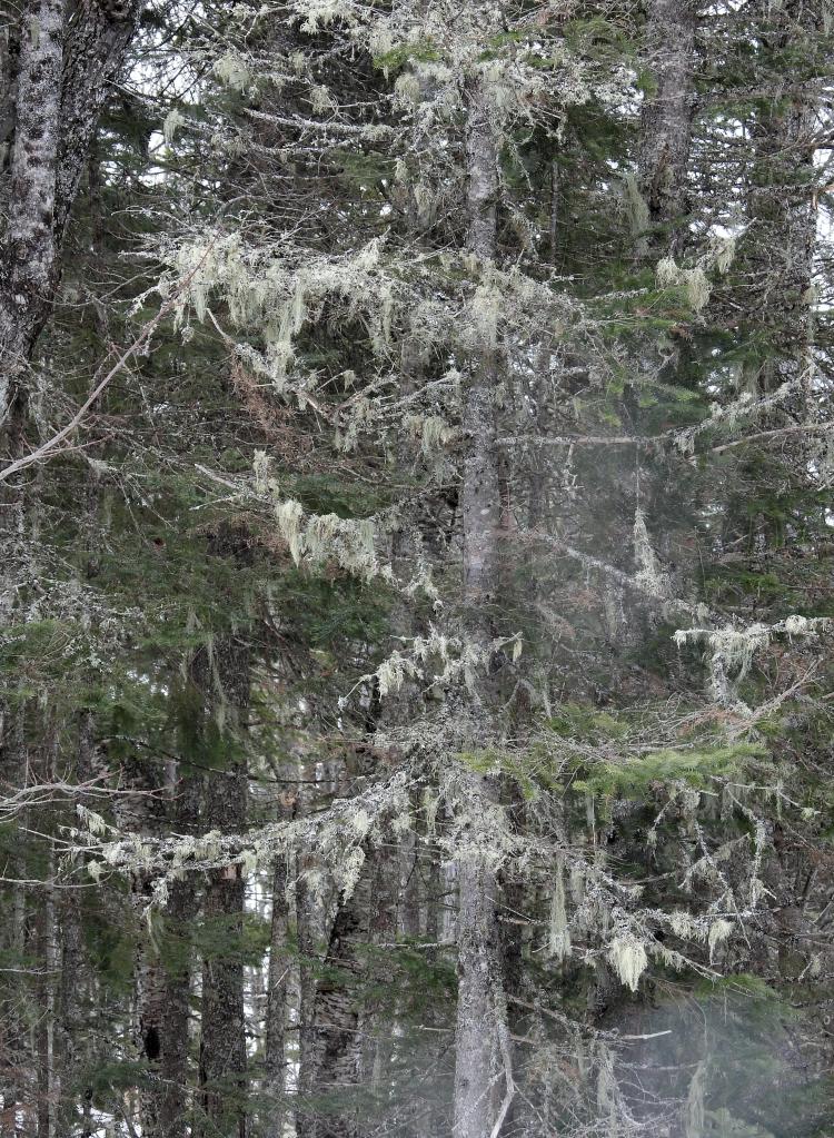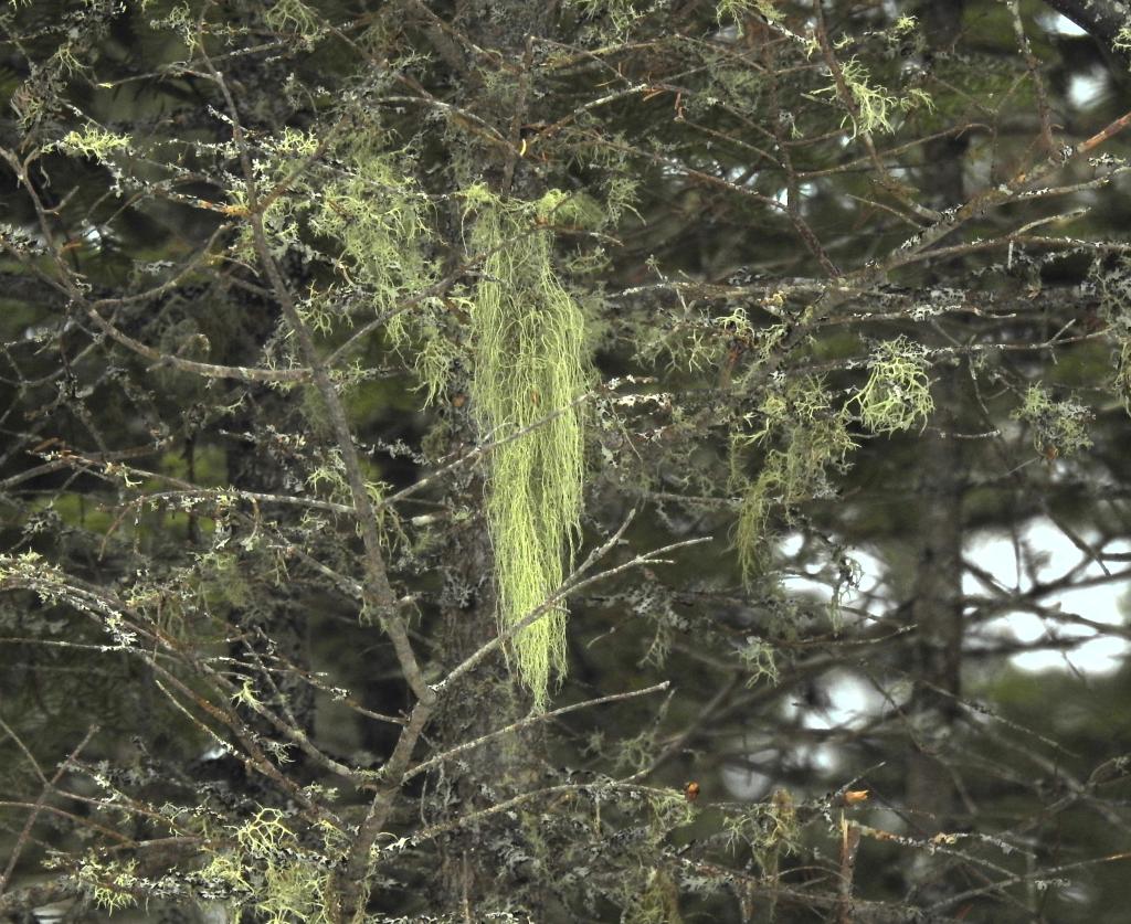 We took a walk south about a mile to a site where Northern Parulas nest. These beautiful warblers use Usnea lichens for nesting. Usnea cavernosa the grayish lichen on the left is common and regularly used for nesting. The longer green lichen is probably Usnea longissima, Methuselah’s beard. This is uncommon but also used by the birds. Once the Parulas are back we will check this site again.