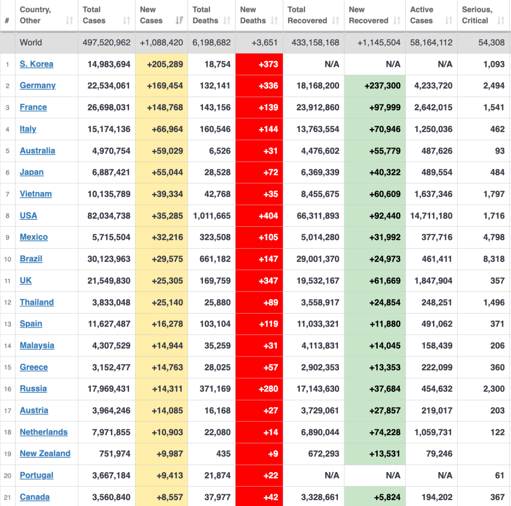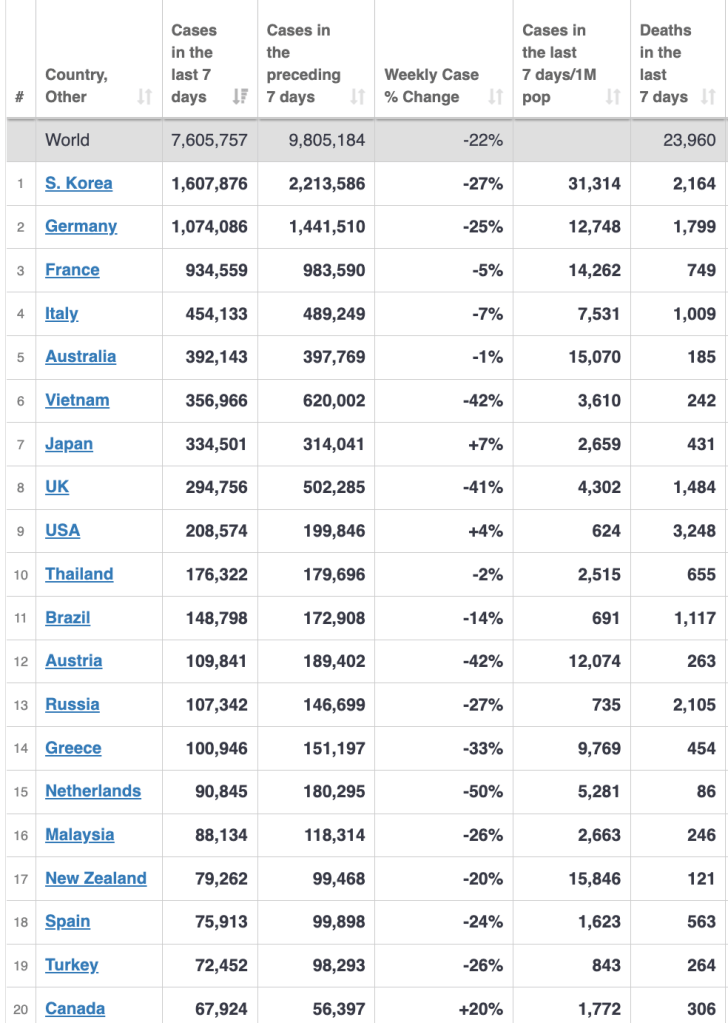 Data from Friday shows that the number of cases is increasing in both the U.S. and Canada. Stay tuned for more reporting in the future, and get you booster and don’t forget your mask (preferably KN95) in public spaces.