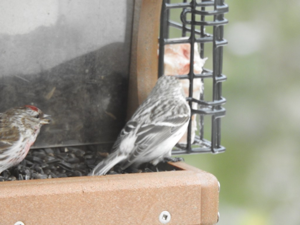 Just as I was about to photograph one of the 3-4 Hoary Redpolls visiting us, a male Common Redpoll chased it away.