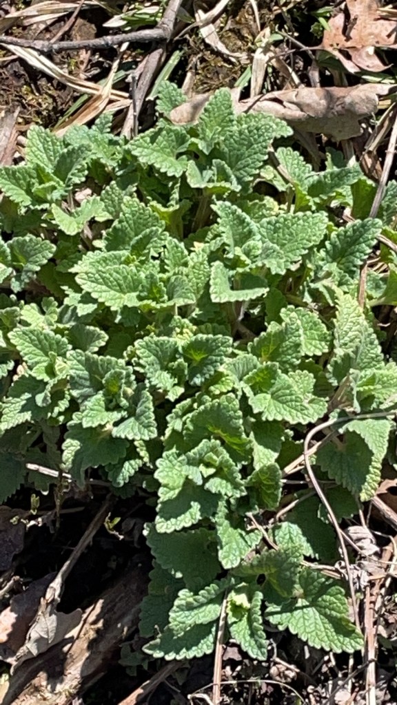 Burdock (only the old seed head) and catnip were already growing new leaves.