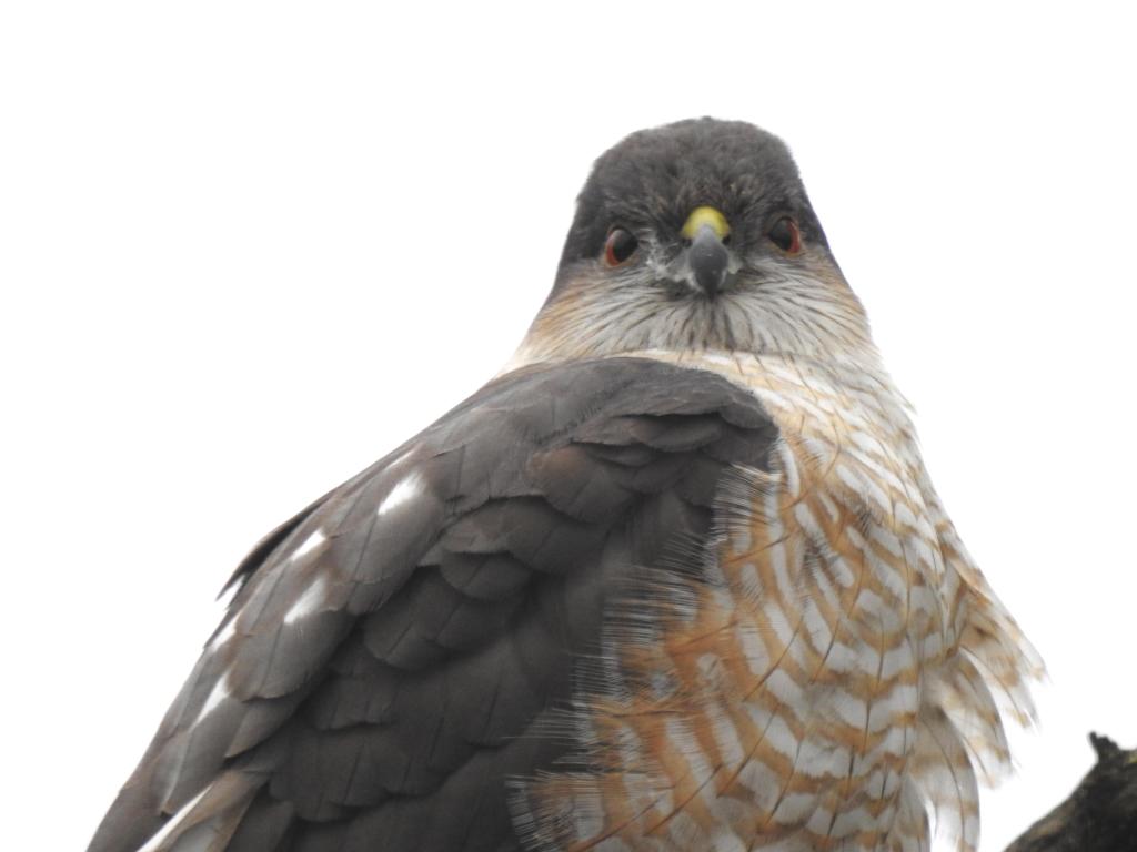 An adukt Sharp-shinned Hawk landed behind the cabin perusing the bird feeders.
