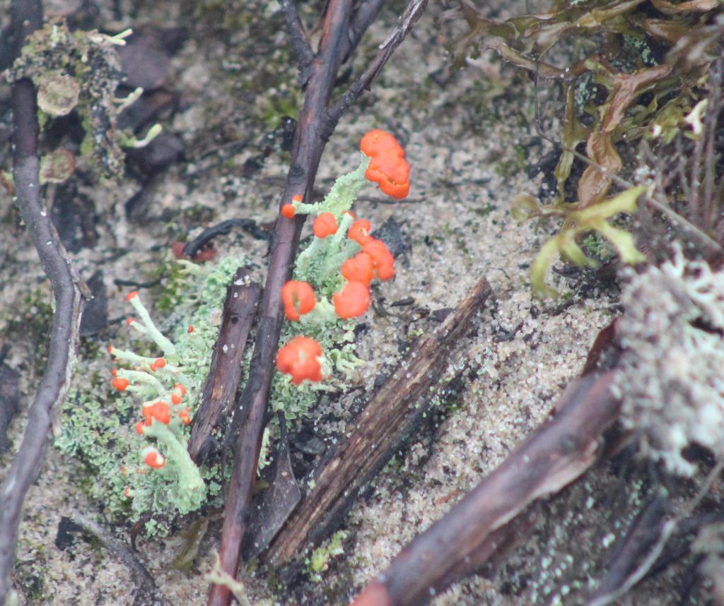 Along the way there were lichens scattered among the dune grasses and plants. This is one of the lichens in the genus Cladonia, commonly called the British soldiers caps (there are about a dozen similar species around here).
