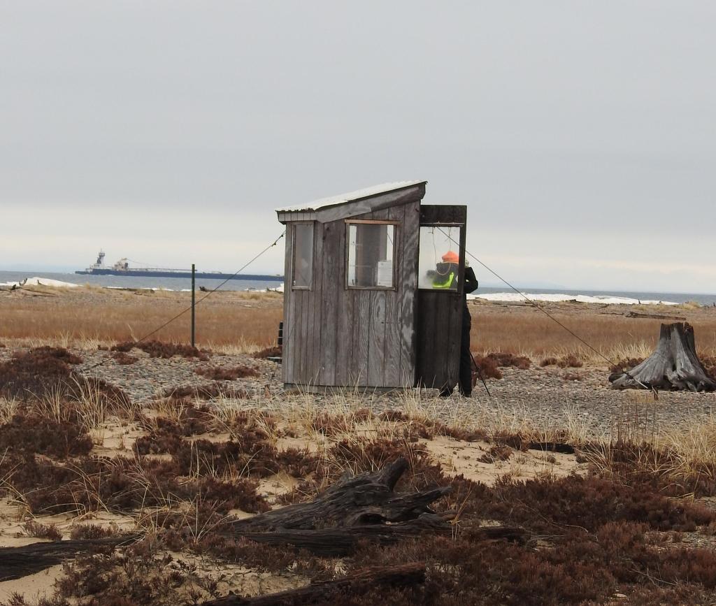 We made our way to the waterfowl counter scanning the “almost” snowless terrain of the point looking for low flying raptors.