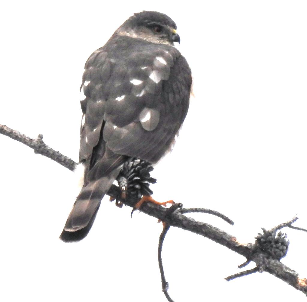 A Sharp-shinned Hawk perched in the mist.