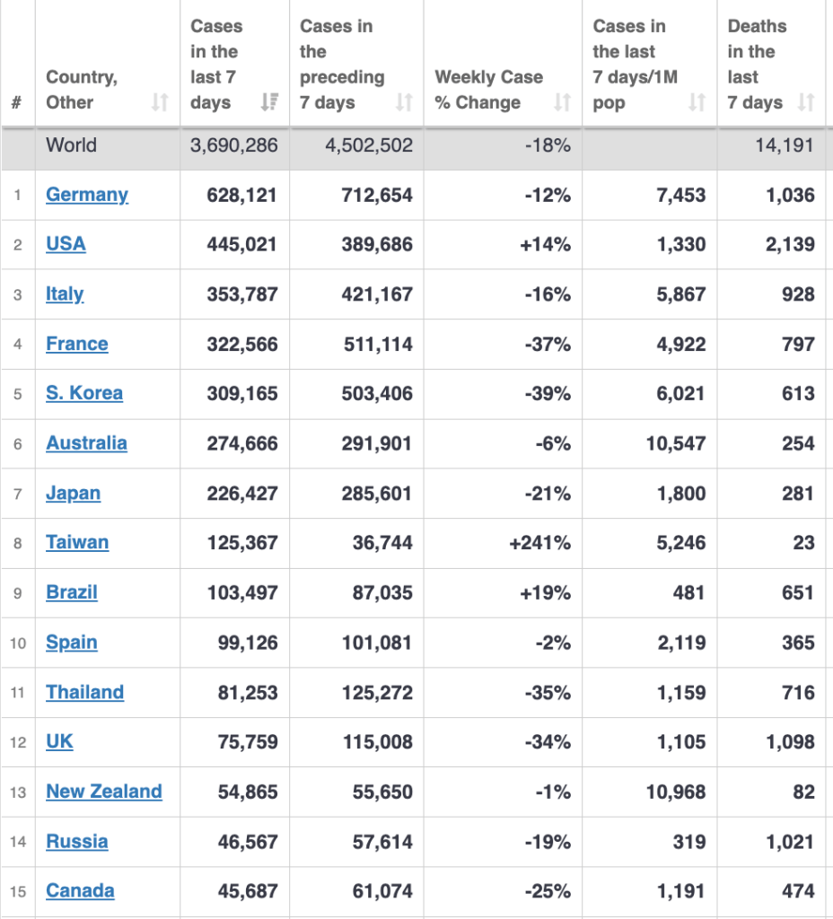 What is clear is that on a weekly basis the US will soon once again be leading the world in new cases. Get boosted and mask when necessary, especially by plane.